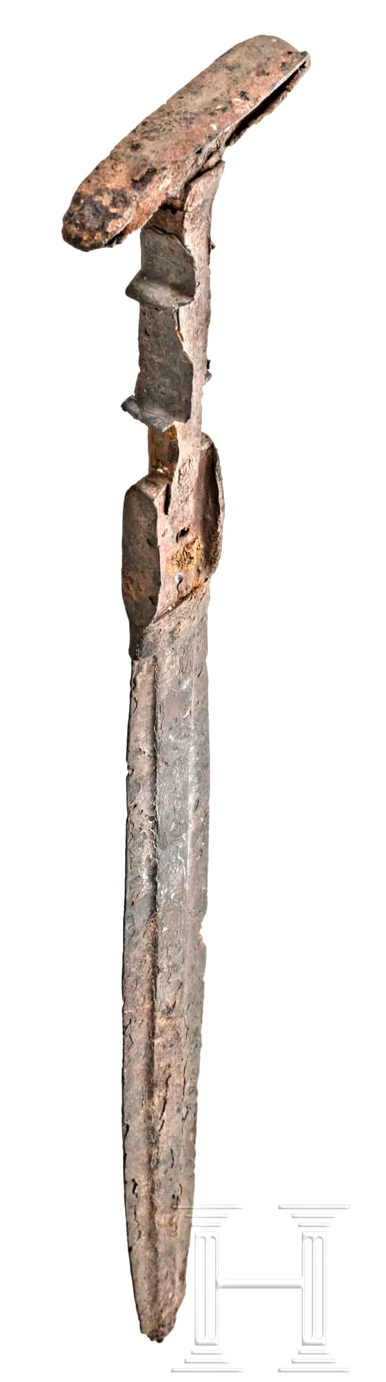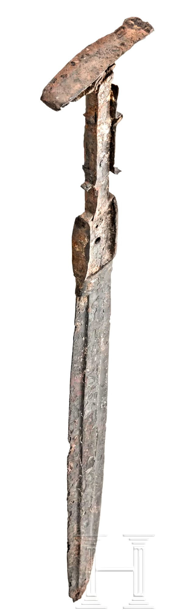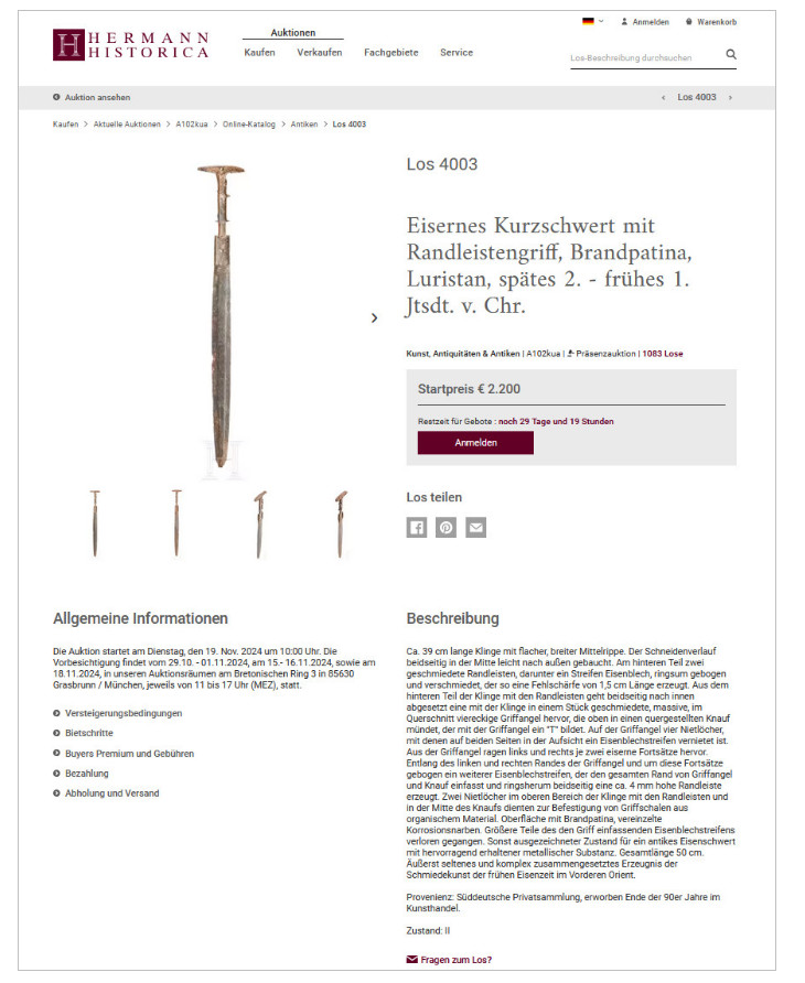 something since two rivets are just nit eniufgh. The double-disc-pommel sword listed here as IMAS 15 did show some traces of gold in its hilt and that might well have been cast into the depression still visible there. If that was indeed the case, we now understand: - The holes intended for final decorative rivets or whatever had to be lined and the lining had to stick out to some extent so the liquids metal couldnt flow out. - The re-enforcement strip is not so much intended for re-enforcement but simply adds volume to the grip and thus decreased the amount of precious metal needed to fill the hilt. - The protrusions and the edge of the pommel could be very small and pointy since the liquid metal would perfectly fill the narrow spaces. No very delicate carving was required. - The big crimp plate might still have held some other precious object. No traces of the inlay are preserved. Maybe the sword was never finished? Otherwise he Brandpatina (fire patina) mentioned by the seller would indicate that the sword was exposed to great heat that might have dissolved the inlay metal or at least loosened it. Brandpatina is never found with true IMAS and thus may indicate that the sword was found in a place a place outside Luristan. | ||||