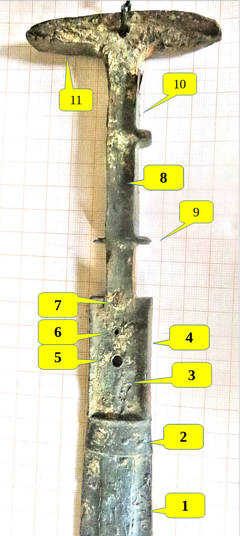 some terms that I am going to use : 1. Blade. This is obvious. 2. Collar / ring. Also obvious 3. Crimp plate - for want of a better term. This structure looks like the crimp plate of real IMAS but crimped anything now lost is unclear. It may be part of the tang of the blade, then it might be connected to the tang-less blade below the collar. 4. Randleiste or side bar of the crimp plate. Here relatively thick. Either part of the crimpo plate / tang or welded on separately. No traces of welding are visible, however. 5. Lined hole, possible for riveting on the decorative inset but this is questionable. It is lined with a cylinder made from thin metal. 6. Hole not well finished. Possibly intended for riveting on the re-enforcement part see below) but then not needed because that part was too short. 7. Rivet through re-enforcement par and the edge of the crimp plate. 8. Re-enforcement part or strip. Its function is rather unclear. Both strips are too thin to enforce much. Why they are riveted and possibly not welded, is uncles. too. There are 4 rivets altogether. Maybe the main part of the tang below the enforcement strips is majorly flawed at some point, sort of like the cut" IMAS 8? Then some enforcement would make sense and welding would not be a good option. 9. Protrusions. Somehow fixed to the tang, probably welded. On protrusion is missing; there are no special features at the break-off area. 10. Side bar (Randleiste) of very thin metal around the whole upper part of the hilt, some of it missing. Thin, but still with a layered structure as we shall see. 11 Pommel. Likely still part of the tang of the bade and completely surrounded by the sidebar. There is a hole very similar to No 5 that also was lined with a thin cylinder that has mostly disappeared, however. The pommel is heavily encrusted with some mineral. I have refrained from cleaning it so far.