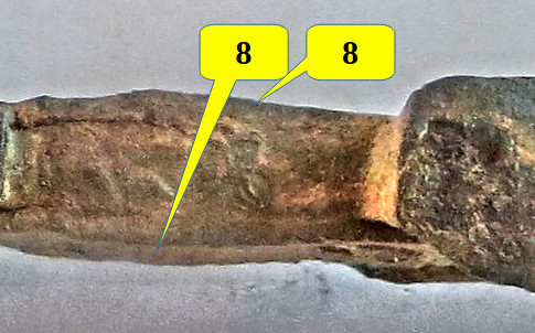 is it is clearly visible: The thins side bar is composed of several even thinner layers. In other words: The thin sheet was drawn out from a piece of faggoted iron. If you are unsure about what faggoting means, use the link or check with the Index function of the hyperscript. Bending the side bar strip around the protrusions and the pommel was a difficult thing to do but welding it on seems to be almost impossible. Yet some old smith did just that. Or was he soldering it on? We know from IMAS 4 that soldering was known (at some time at some place and to some smiths). There is no indication of soldering as far as one can see in a microscope, so we must assume that the old smith could do some micro fire welding. How he did that without just burning off the fine structure is an enigma to me. We must assume that the final side bar went all the way down to the crimping plate to hook up with the more solid side bar there. There are no indications of that, however. It would have been a bit awkward, too. Maybe the old smith had a more elegant solution? That would deepens, maybe, on the nature of the inlay. |