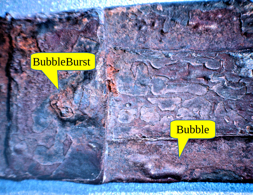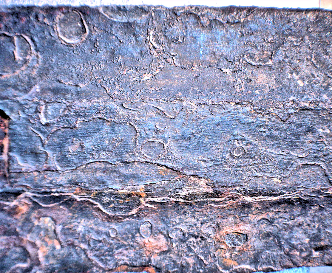 Luristan mask sword blades. Elegantly curved with a well -defined midrib. The corrosion pattern is remarkable. Layers of constant thickness are peeling off, starting as bubbles that grow and eventually burst. That indicates that corrosion proceeds through a small opening below a layer in a weak interface. It then spreads sideways, mos likely along imperfect welding interfaces. Gas is related and lifts the iron on top to form a bubble. |