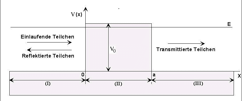 | Das Potential ist definiert durch: V = 0 in Gebiet (I), V = V0 in Gebiet (II) und V = 0in Gebiet (III) | |||||||